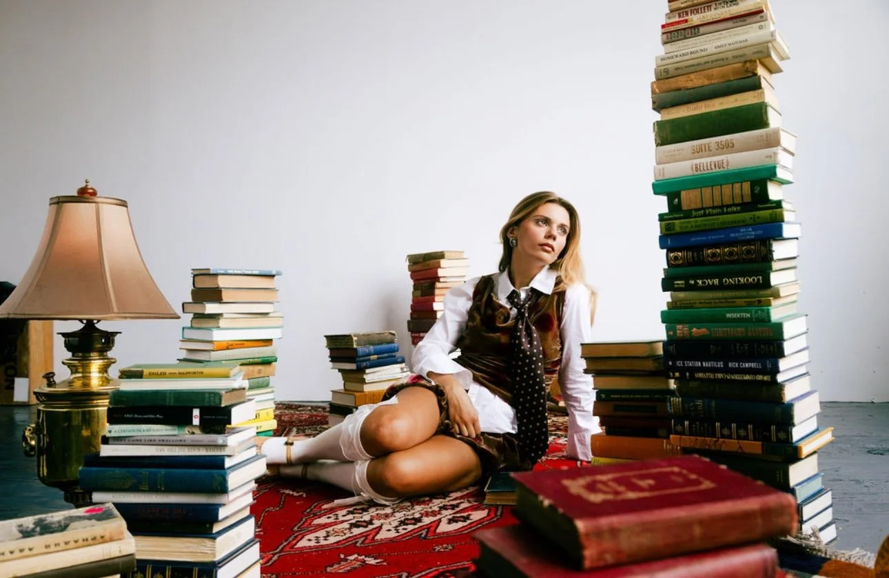 That day was such a blast. I think the books were rented from a library in Brooklyn. They were super old and dusty and falling apart which definitely added to the aesthetic but flared up my allergies lol. The funniest moments were when the book piles kept falling. We worked so hard to stand them up and position them just right. Gravity was against us that day. They actually fell ON me which is so funny now looking back but in the moment I felt very diva like ‘how dare these books fall on ME’.