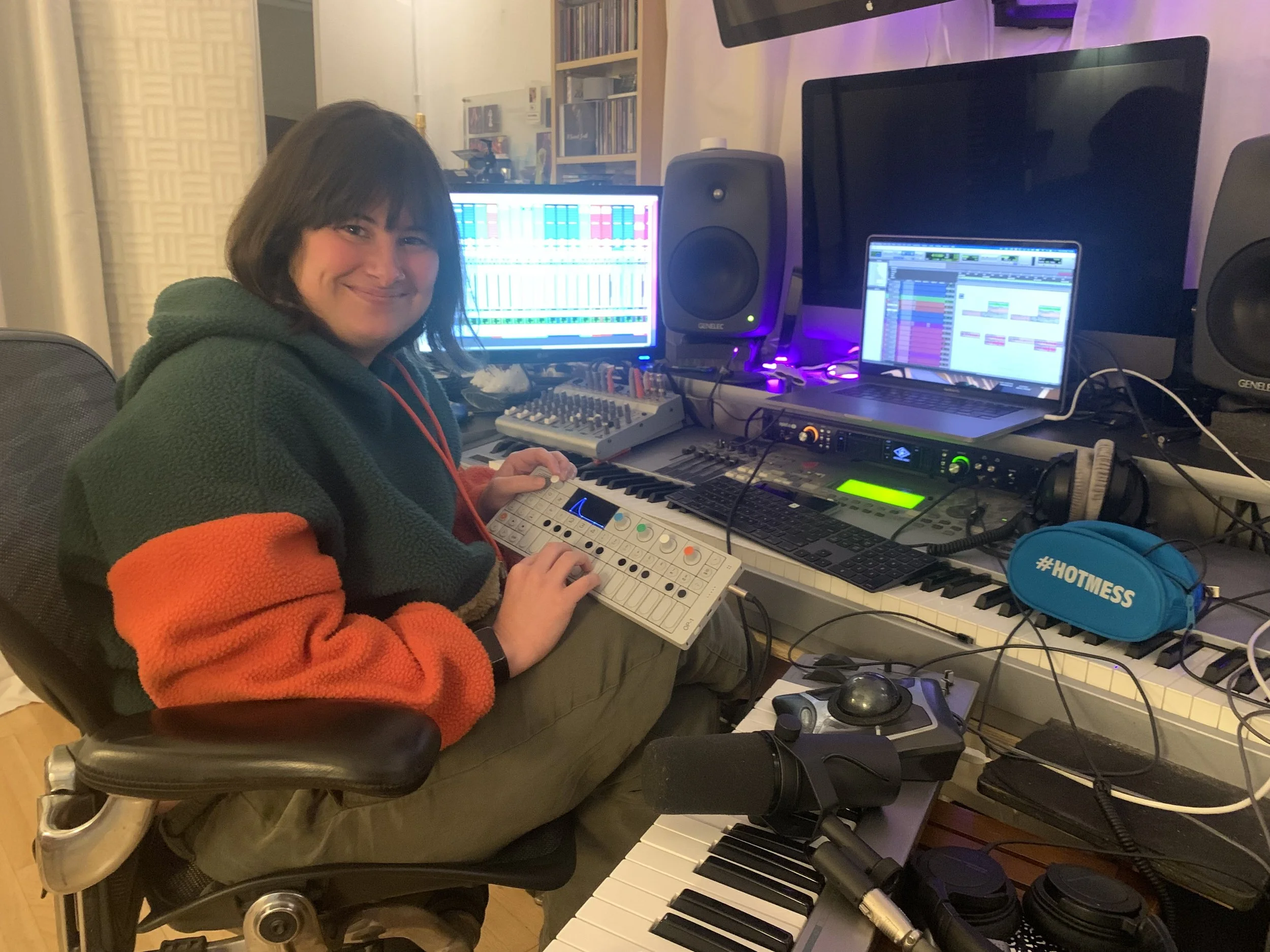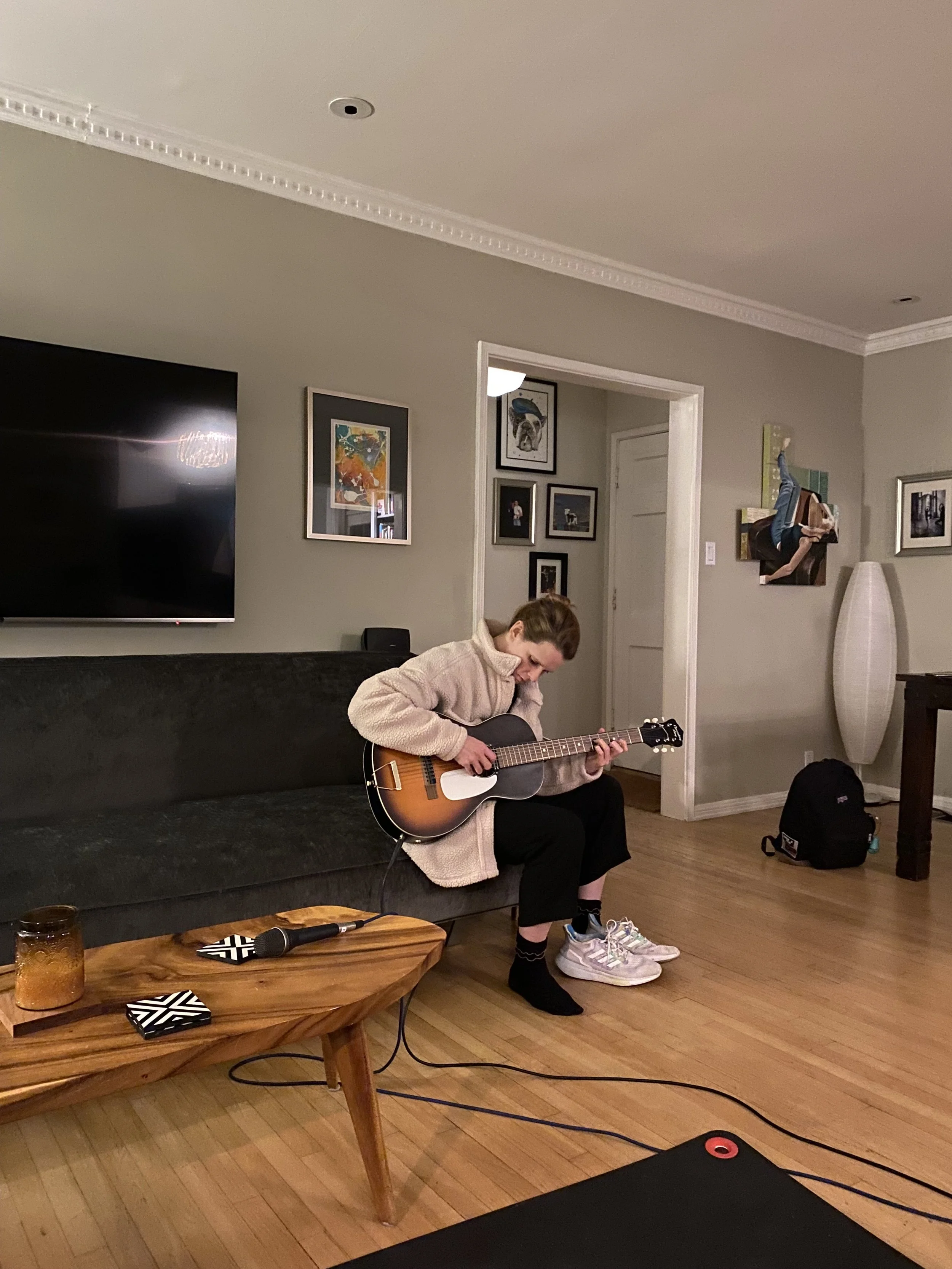 Stephanie Marziano demoing at the Airbnb, late February 2023. Image courtesy of Stephanie Marziano, used with kind permission from Cassandra Jenkins.