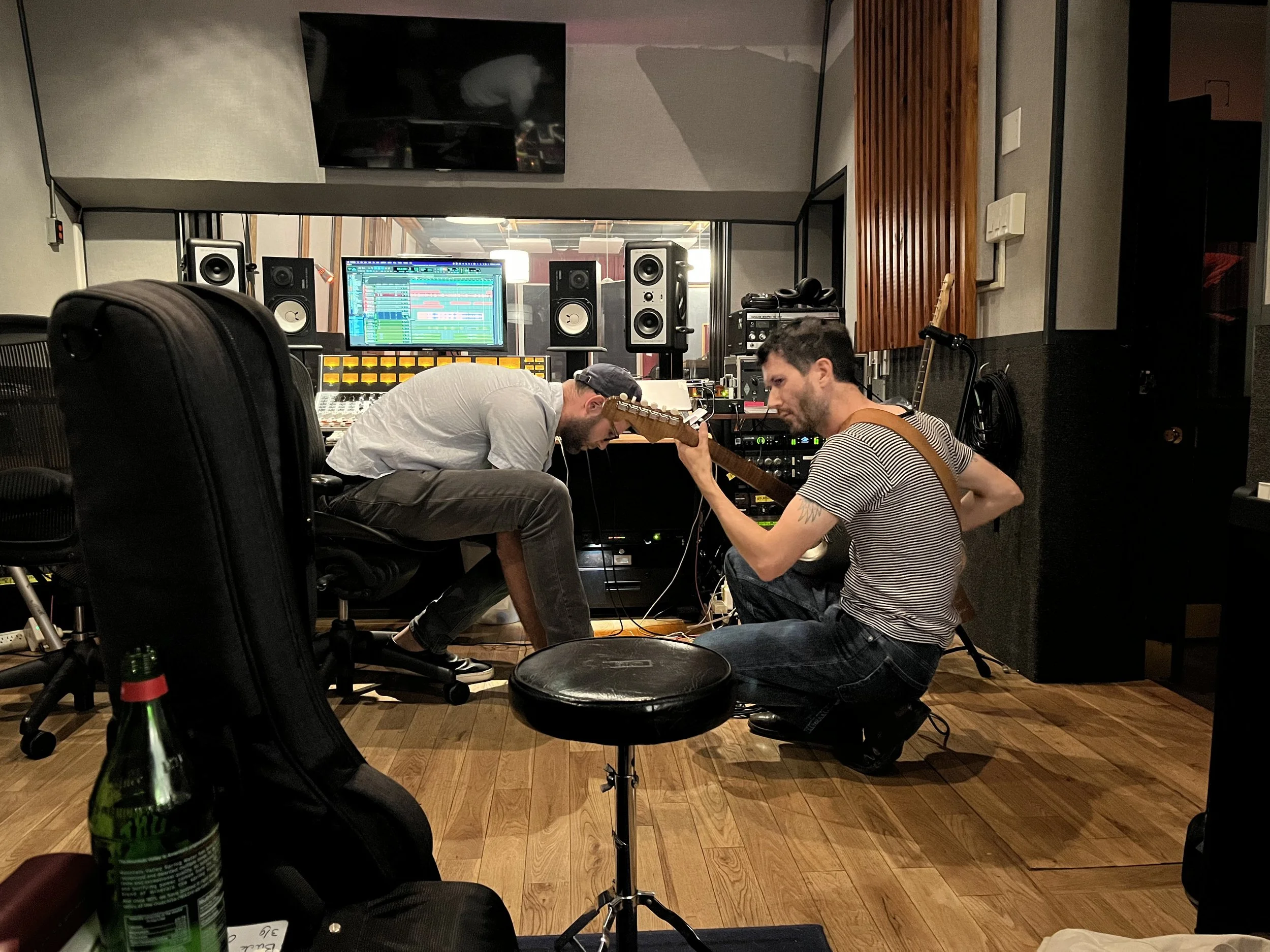 Andrew Lappin with Adam Brisbin at Wax LTD Studios in Los Angeles, California. (Adam played guitar on ‘Devotion’, ‘Clams Casino’, ‘Aurora, IL’ and ‘Petco’). Image courtesy of Cassandra Jenkins.