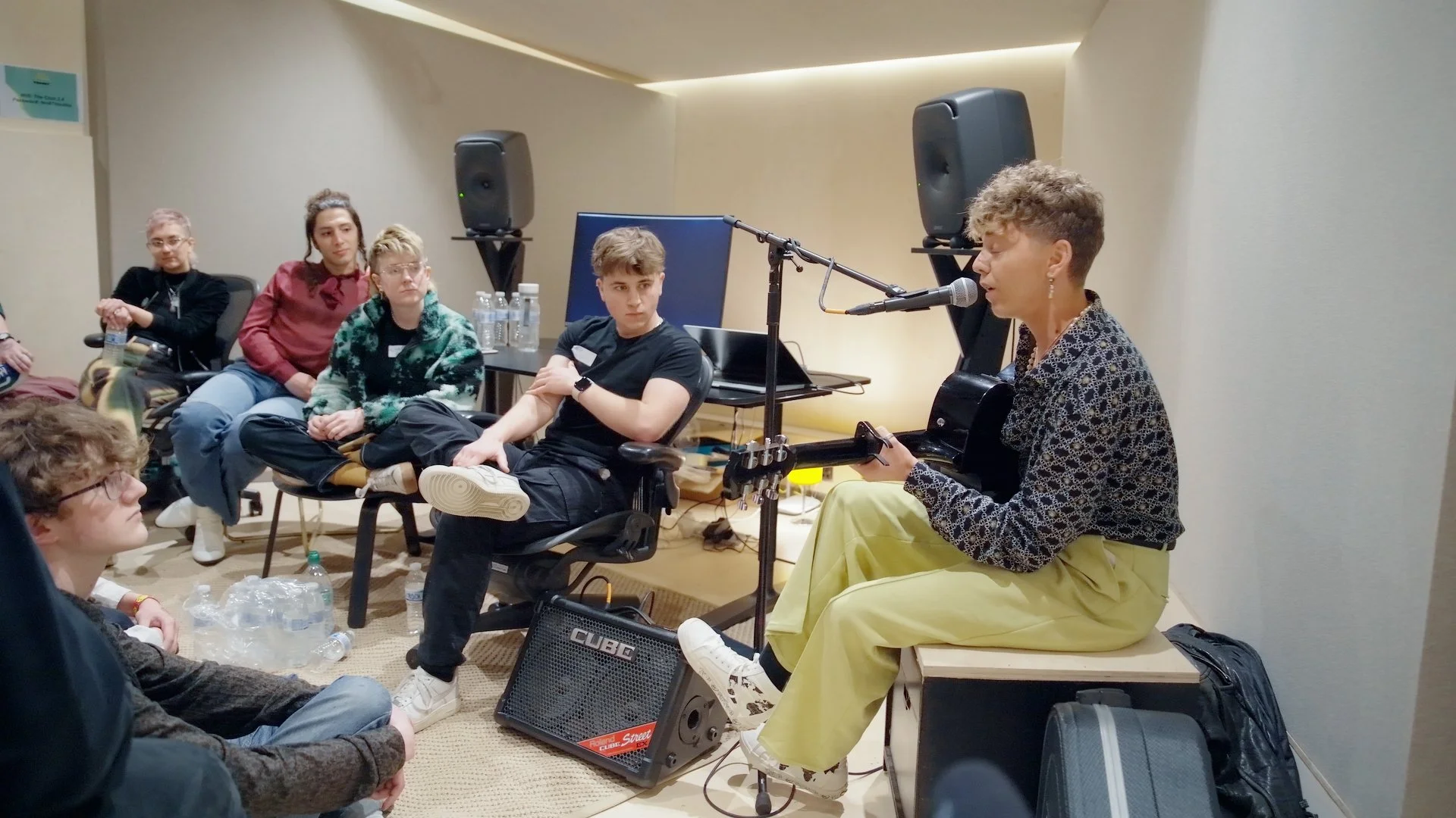 The audio workshop was bookended by performances from singer/songwriter and trans artist Dylan Holloway (he/him), who began by playing a song called ‘Gotta Let Her Go’. The first track to be reviewed by the team was ‘Want To Stay’, the debut single by TS Autopilot who was in attendance. The self-produced, written and mixed track garnered comparisons from the panel to the trademark sound of a James Bond theme with their mesmerising voice and soaring string arrangement.